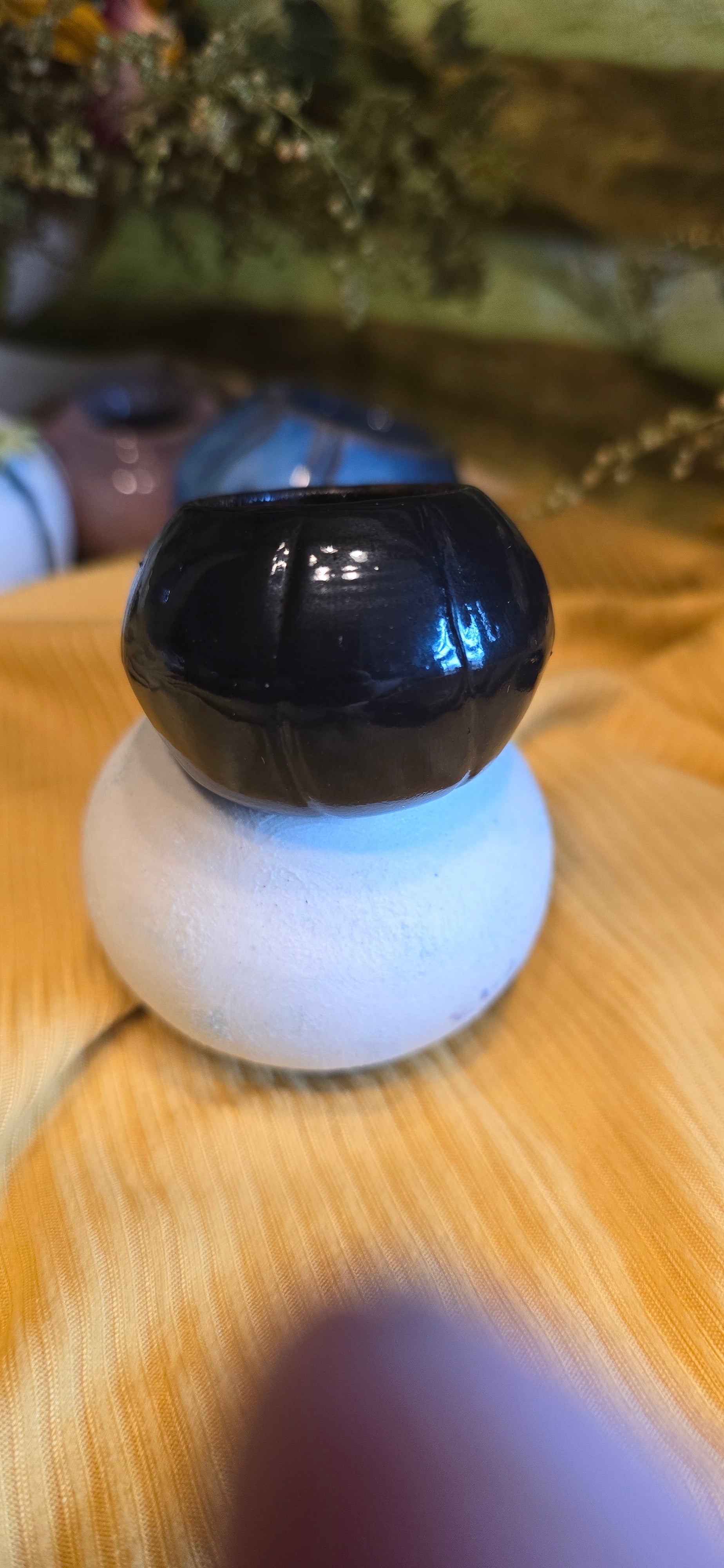 Introducing the Glossy Black Mini Pumpkin Planter - the perfect addition to your home decor. With its glossy finish and classy design, this mini planter will add a touch of elegance to any room. Showcase your plants in style with this must-have piece.
